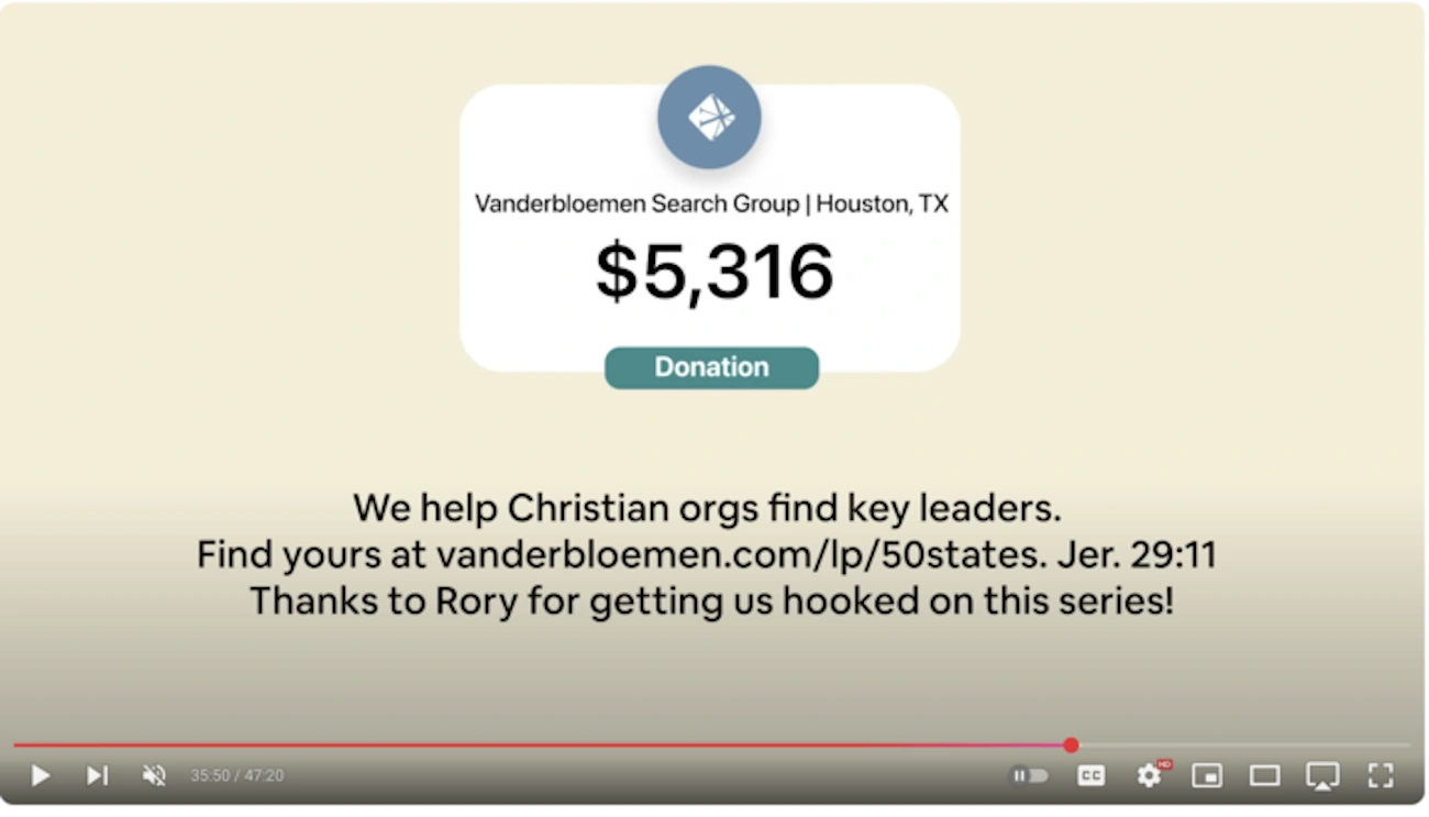 “We help Christian orgs find key leaders. Find yours at vanderbloemen.com/lp/50states. Jer. 29:11 Thanks to Rory for getting us hooked on this series!”